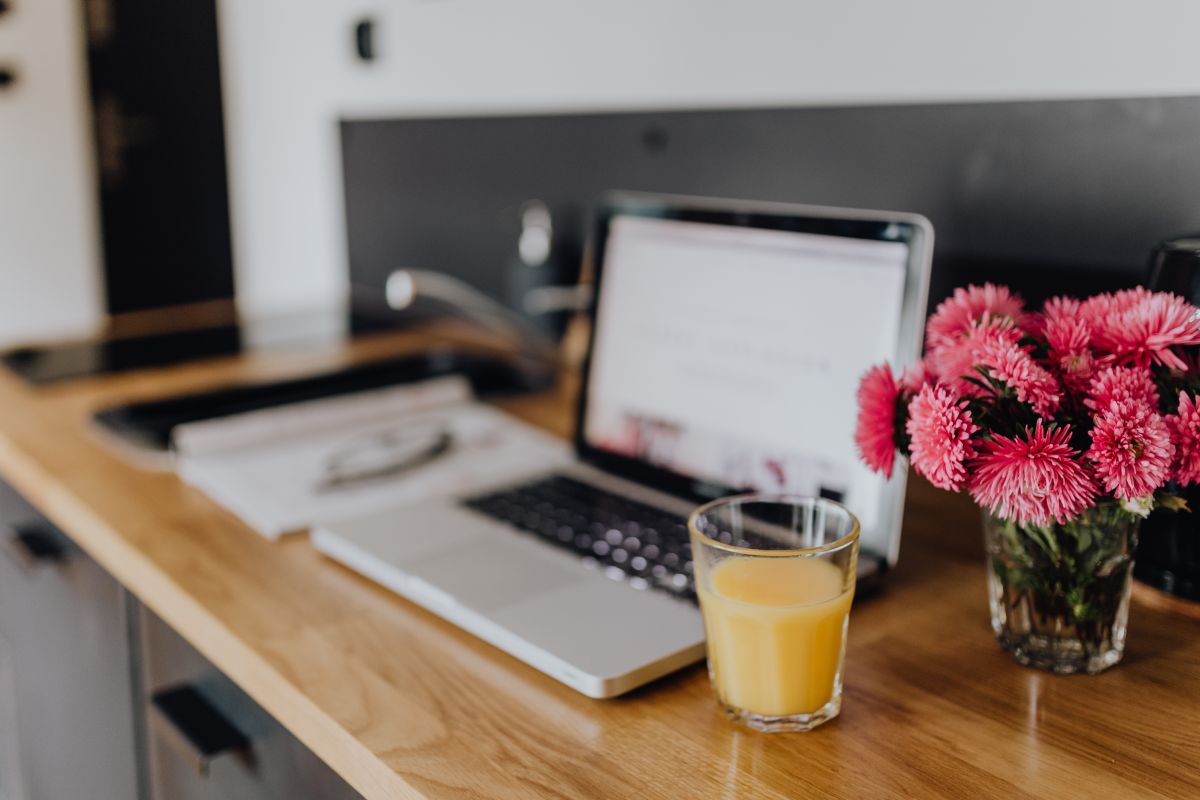 Within the foreground, a pc, almost definitely a MacBook, and a laptop computer sit aspect by aspect, representing the trendy office and residential workplace environments. The presence of those gadgets means that this house isn’t solely a visible deal with but additionally a useful and productive workspace. The blooming bouquet provides a contact of nature and serenity to the in any other case modern and high-tech surroundings.